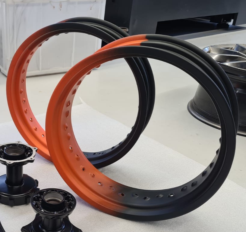 Wir bieten dir hiermit die Pulverbeschichtung deiner Supermoto / Mx Felgenrings als zweifarbige Beschichtungsvariante mit Farbübergang (Fade) an.